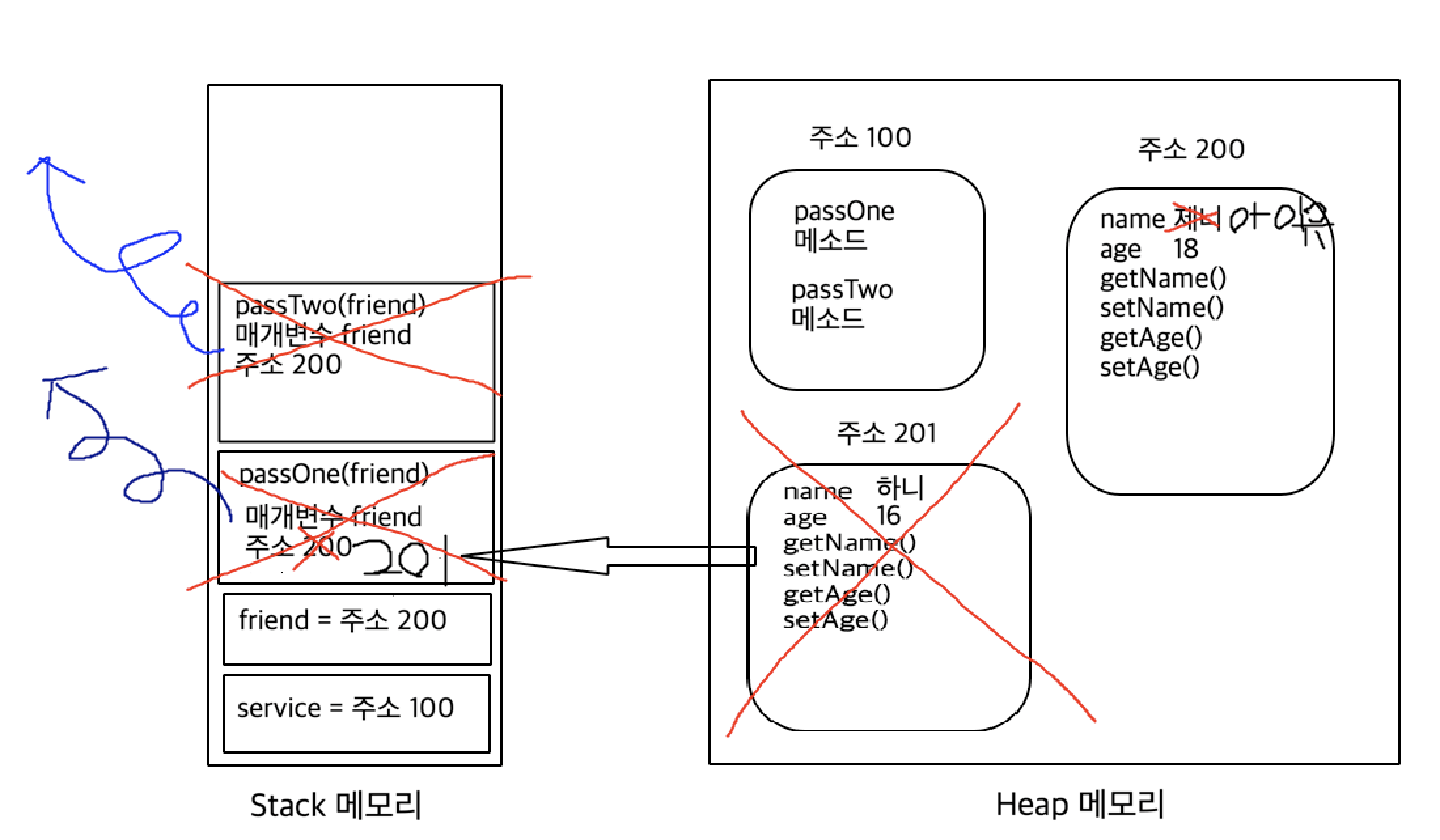 변수에 instance를 할당하는 것은 주소값으로만 할당하기 때문에 매개변수 friend의 주소 값이 201로 변경되는 것이지