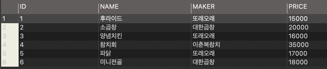 예제 1. MAKER가 또래오래, 대한곱창인 FOOD를 조회