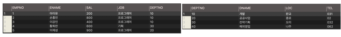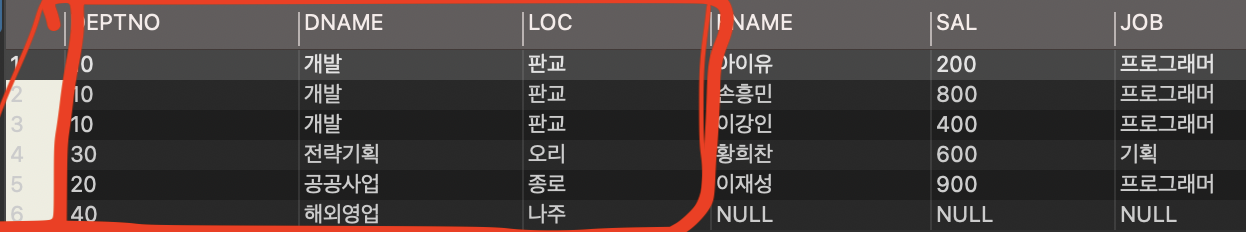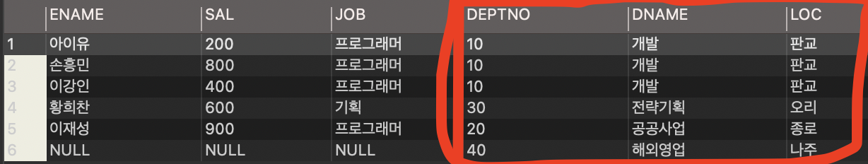 보시면 아시겠지만 deptno 40 의 값은 department 테이블의 모든 값이 나와야하는 상황이어서 나왔지만 옆에 붙은 employee 테이블에는 40에 대한 값이 없기 때문에 NULL 값으로 처리가 되었습니다.