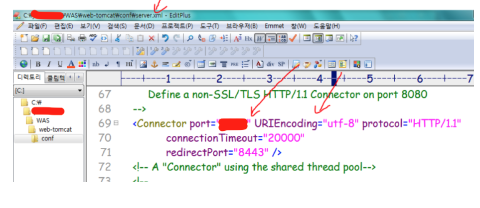 apache-tomcat-9.075/conf/server.xml를 열어 내용수정을 합니다.