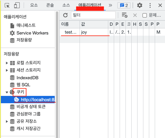 저희가 설정한 test 와 joy 가 나오게 됩니다. 저 쿠키가 20초동안 저장되었다가 사라지게 됩니다.