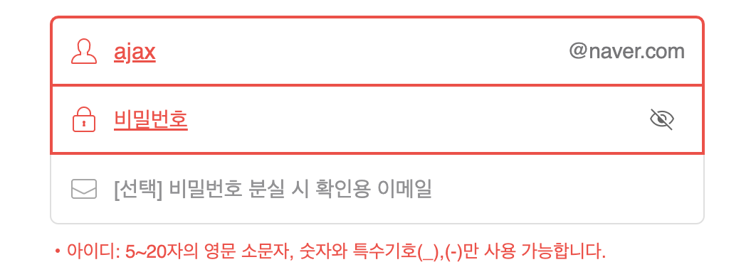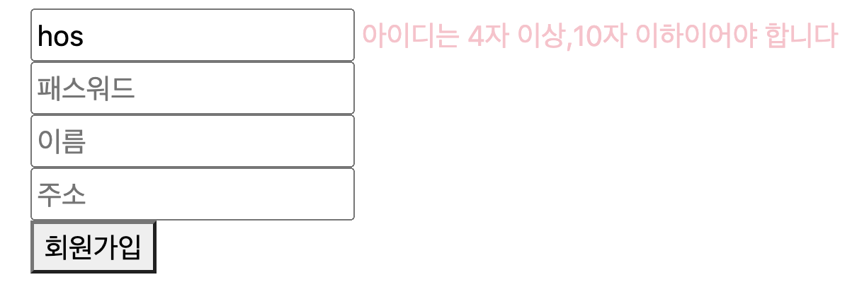 3. input 박스 안에 있는 value 값의 글자 수가 4~10자가 아니면 핑크색 글자로 아이디 input 박스 옆 span박스에 알림을 줍니다.