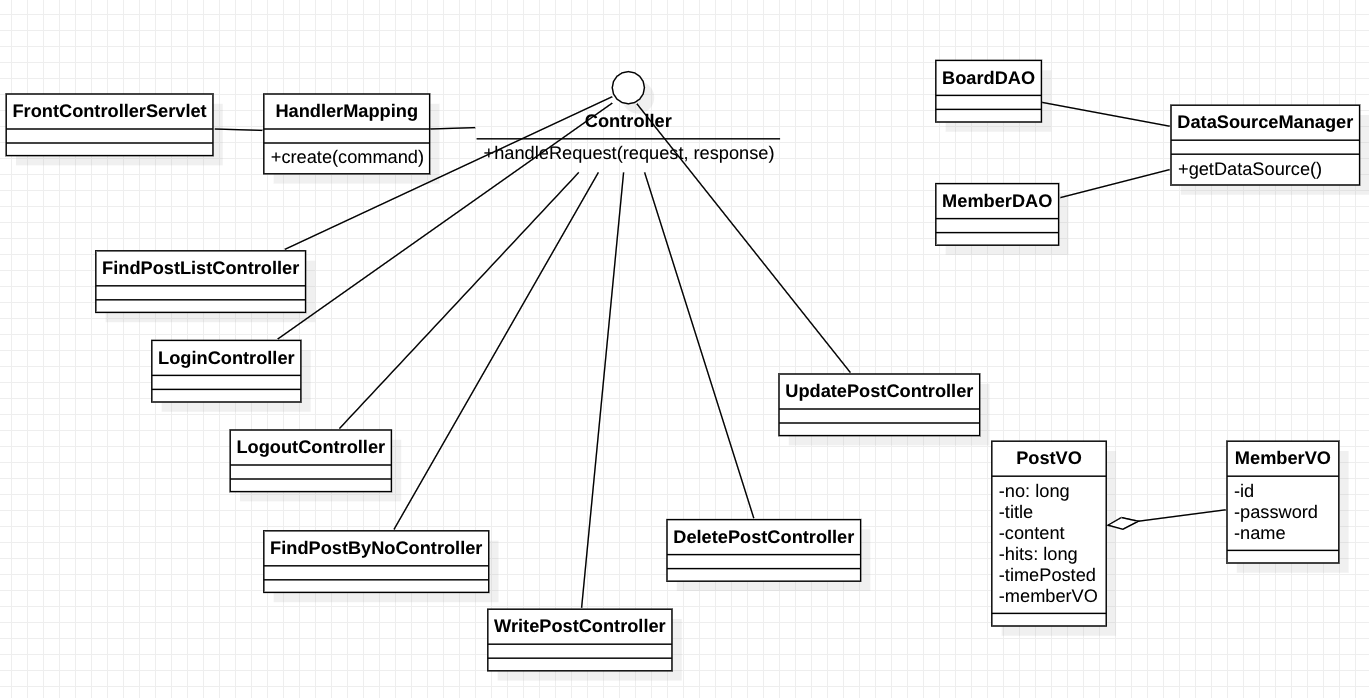 저번에 알아본 FrontController와 DAO, VO를 이용하여 Class, Interface, 그리고 그들의 관계를 표현했습니다.