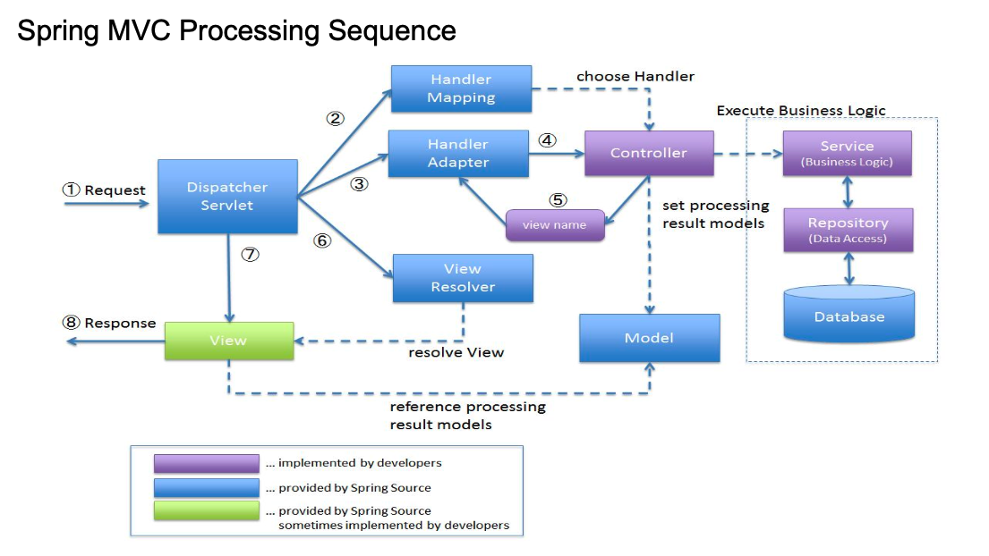 1. 클라이언트로부터 HTTP 요청이 도착합니다. DispatcherServlet이 해당 요청을 받습니다. 이는 웹 응용 프로그램의 전반적인 흐름을 제어하는 중앙 컨트롤러 역할을 합니다.