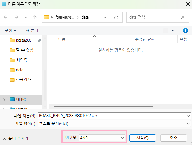 2. 메모장에서 다른 이름으로 저장하기를 누르고 인코딩을 ANSI로 변경해줍니다.