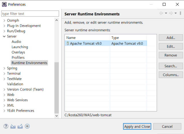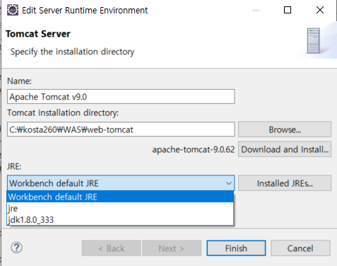 Window > Preferences > Server > Runtime Environment 설정에 가보면