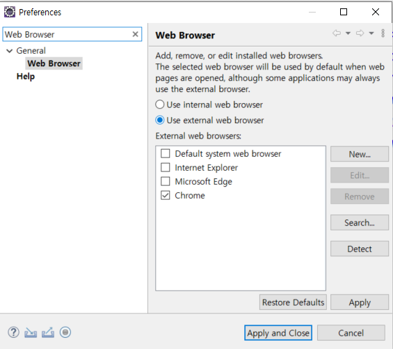 이러한 에러가 나오게 되는 이유는 Eclipse 설정 파일 web browser에서 설정한 웹브라우저의 저장 위치에 대한 설정이 잘못되어있을 확률이 대단히 높습니다.