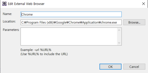 Edit을 누르면 위와 같은 창이 뜨고, Browse... 버튼을 눌러서 Chrome이 저장된 위치를 찾아보도록 합시다.
