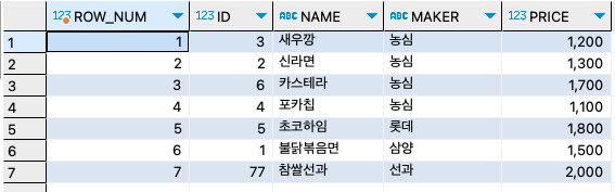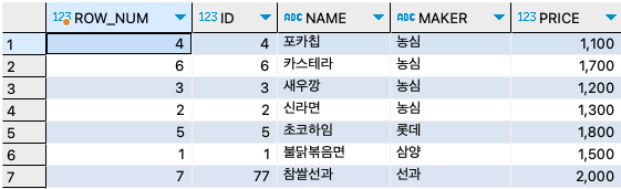 기존에 있던 row_num의 숫자는 변경되지 않고 maker의 이름이 오름차순이 되었습니다.
