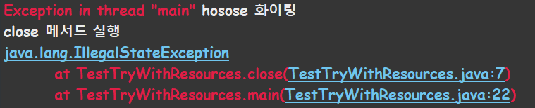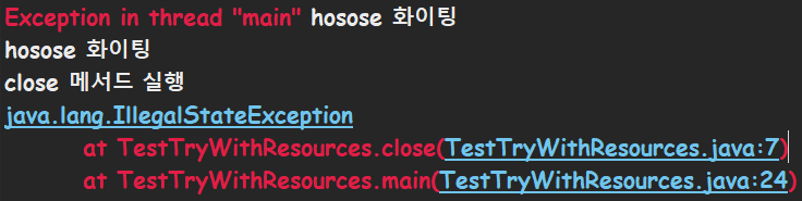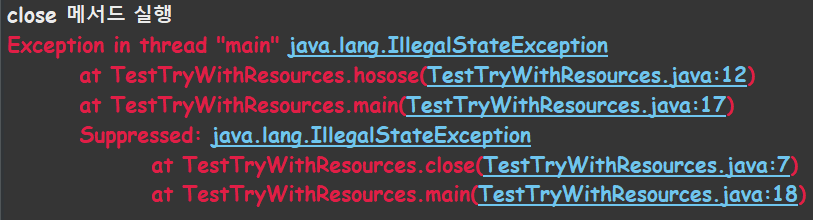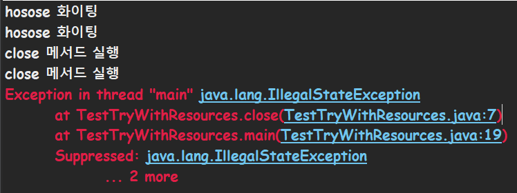 이번에는 try-with-resources를 이용해서 실행했는데 hosose 메서드에 있는 에러와 close 메서드에 있는 에러 둘 다 발생했습니다! 정말 신기하고 잘 만들었네요.