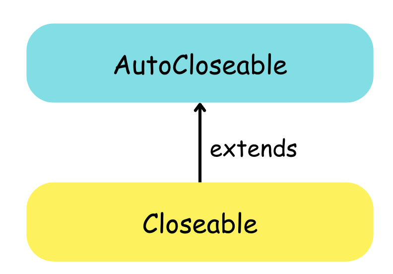 먼저 만들어진 Closeable 인터페이스에 부모 인터페이스인 AutoCloseable을 추가함으로써 하위 호환성을 100% 달성함과 동시에 변경 작업에 대한 수고를 덜었습니다. 만일 Closeable아래 AutoCloseable이 생기면 코드를 변경해야 하는 이슈가 발생하여 Java 업그레이드를 진행하지 않겠죠?