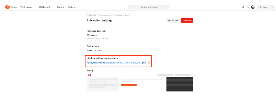 9. 이후 Publish 된 API Documentation 관련 링크가 아래 사진과 같이 출력됩니다. 해당 링크를 클릭하여 접속합니다.