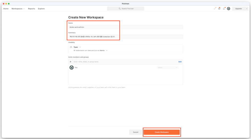 2. New Workspace 박스를 클릭하면 아래의 내용과 같이 새로운 WorkSpace를 생성할 수 있습니다. 이 때 자신이 맡은 프로젝트와 관련된 팀이름 또는 프로젝트명을 활용하여 WorkSpace명을 짓고 간략한 설명문을 작성합니다.
