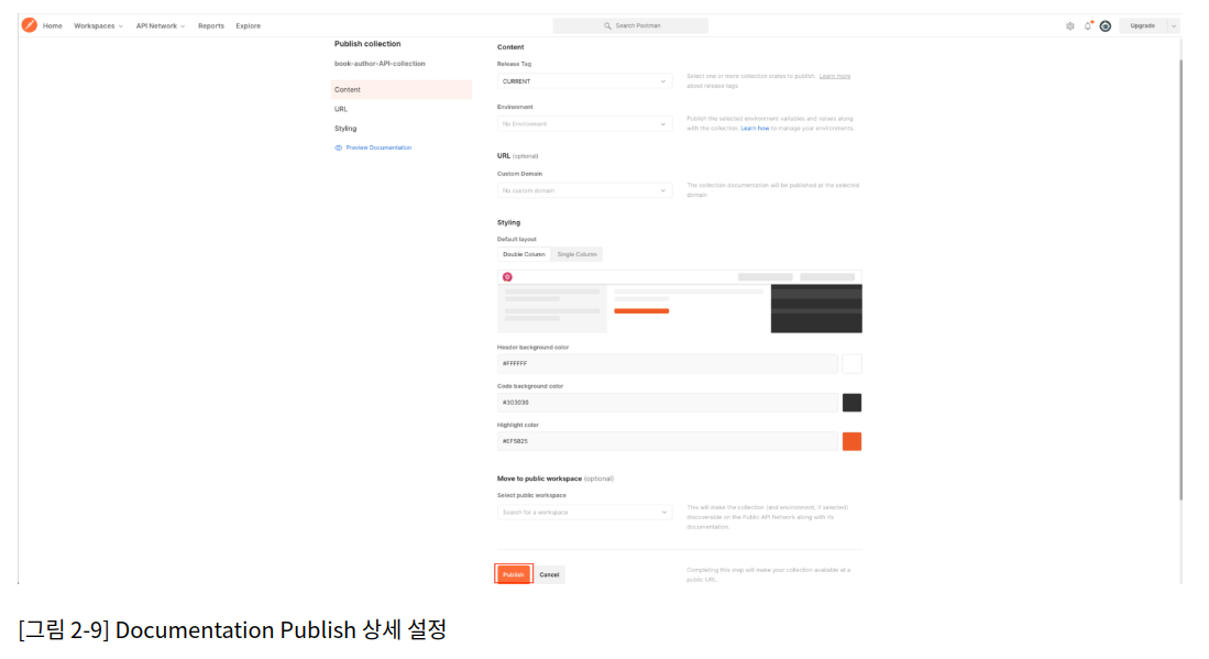 8. 이후 화면은, 내가 작성한 API 들을 documentation 관련 내부 요소를 상세 설정할 수 있는 페이지로 전환됩니다. 모든 내역을 내가 의도한대로 설정하신 이후 하단의 publish 버튼을 클릭하여 최종적으로 배포를 마무리 합니다.