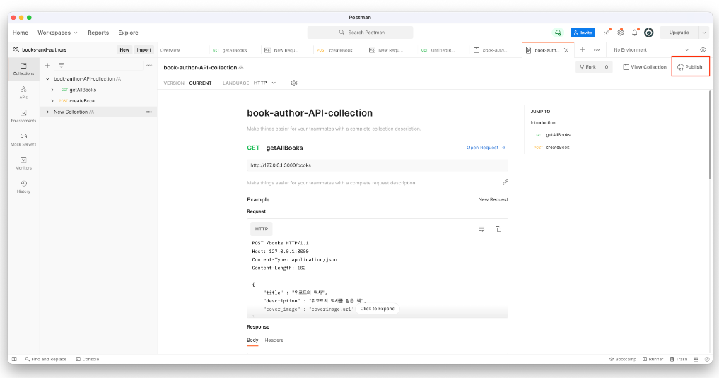 7. 이후, 좌측에 example 형식으로 저장된 내 요청들과 example로 저장된 하위 목록들을 들어가서 살펴 본 후 우측 상단의 publish 버튼을 클릭합니다.