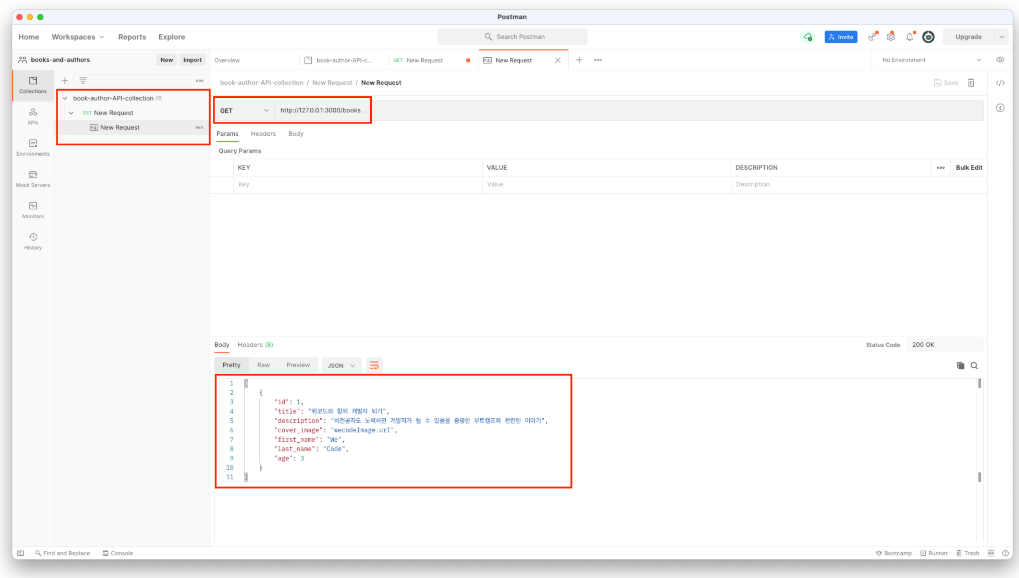 4. 새로운 Collection 페이지 내부 좌측 배너에서 새로운 http request를 생성합니다. 이 후 http 메소드를 설정하고 원하는 URI를 주소란에 치면 내가 의도한 통신 요청을 보낼 수 있습니다. 요청이 성공한 이후에는 아래와 같이 반환된 결과값도 확인해봅니다.