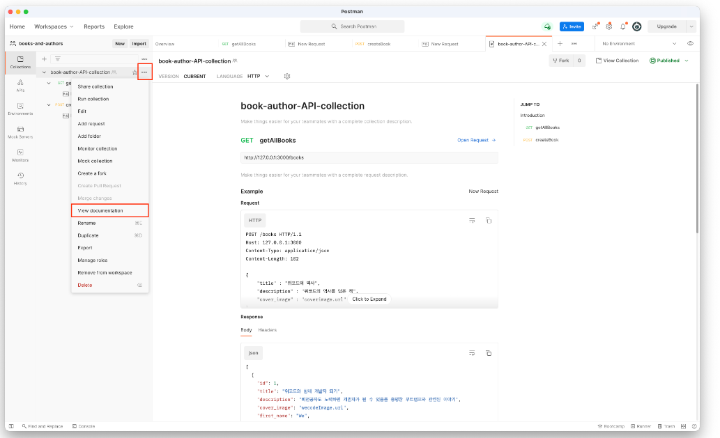 6. 이후 좌측 배너 우상단의 *** 표시를 클릭하여 View Documentation 버튼을 클릭합니다. 이후 내가 작성한 요청들을 정리한 내역들이 우측 화면에 노출되면 내가 의도하여 작성한 내용이 맞는지 확인합니다.