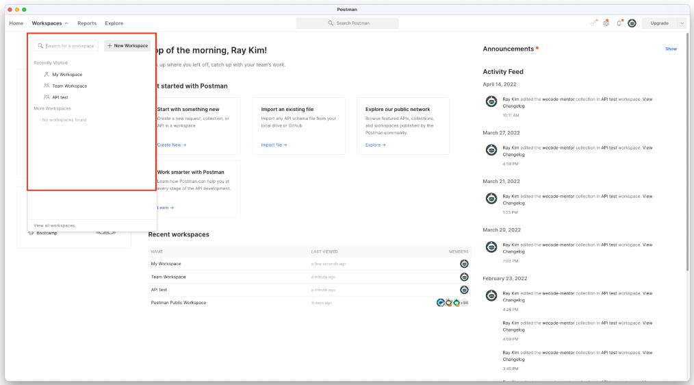 1. postman을 설치하고 실행 후 메인 홈 화면 좌측 workspace 란을 확인합니다.