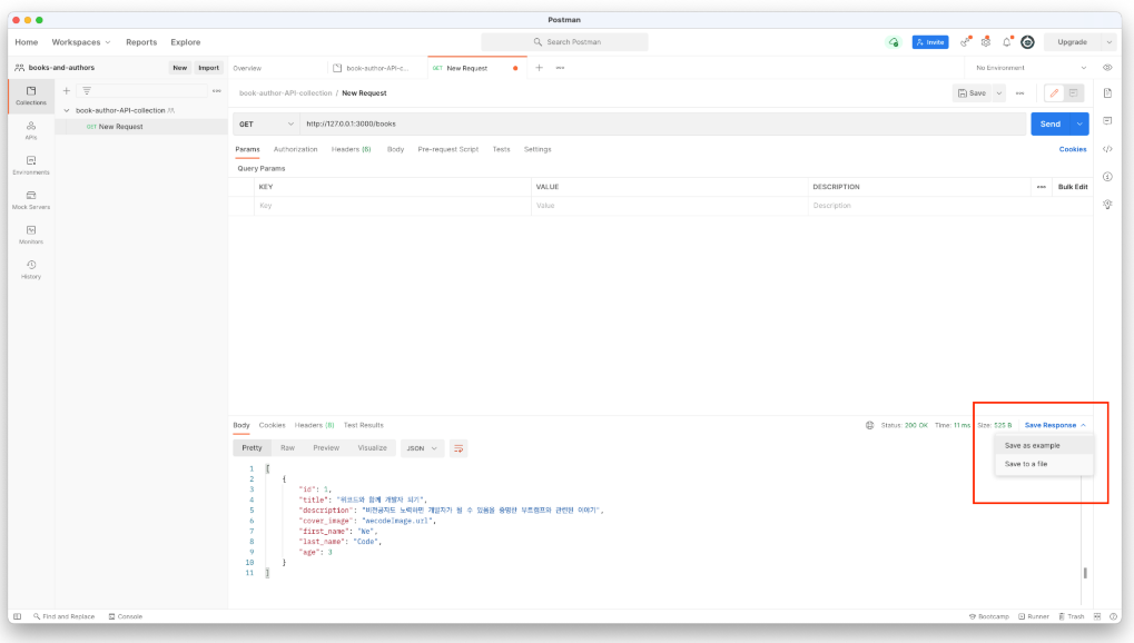5. 이후 우측 하단에 Save Response 영역 내부에 있는 save as example 버튼을 클릭하여 해당 내용을 Collection의 예시로서 저장해줍니다. 이 절차를 따라야만 추후 문서화 작업시에 내가 원하는 API 내역으로 저장 및 추가 할 수 있습니다.