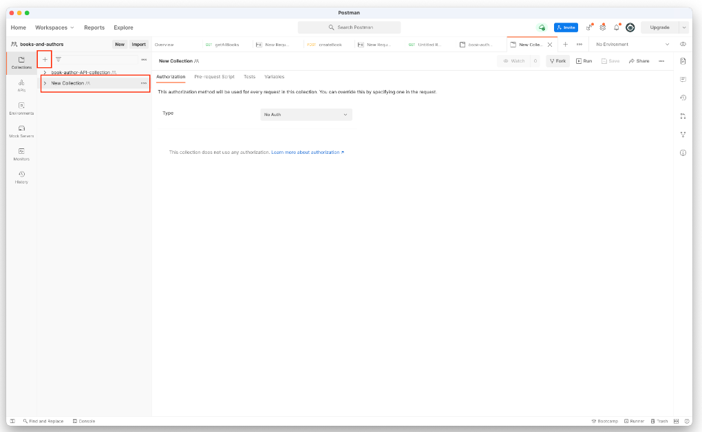 3. 이후 새롭게 페이지가 하나 생성됩니다. 좌측 Collection 부분의 + 버튼을 클릭하여, 새로운 API Collection (모음집)을 만듭니다. 그 후 소속된 프로젝트와 동일한 명칭등, 팀원들끼리 사용 하기에 적절한 Collection 명칭을 지어 줍니다.