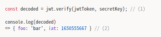 - (1): verify() method로 JWT의 Payload 확인, 첫번째 인자로 JWT가 두번째 인자로 토큰을 만들 때 사용한 Secret Key가 들어갑니다. 토큰을 만들 때 사용한 Key가 아니라면 에러가 발생합니다.