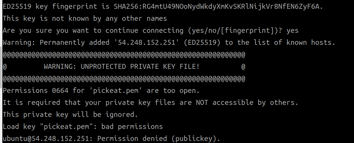 명렁어를 입력하니 다음과 같은 경고문이 출력되고 의도와는 다르게 접속이 되지 않는 것을 볼 수 있습니다. 해당 경고문을 자세히 살펴보면 Permissions 0644 for ‘Demo.pem’ are too open.이라는 문구를 볼 수 있습니다. 간단하게 해석해보면 pem 파일의 권한 0644는 너무 많이 오픈되어있다. 라는 의미이고, 이는 보다 안전하게 관리해야 할 pem 파일에 너무 많은 권한이 주어졌을 경우 발생하는 경고입니다. 따라서 다음과 같은 명령어를 입력하여 권한을 수정합니다.