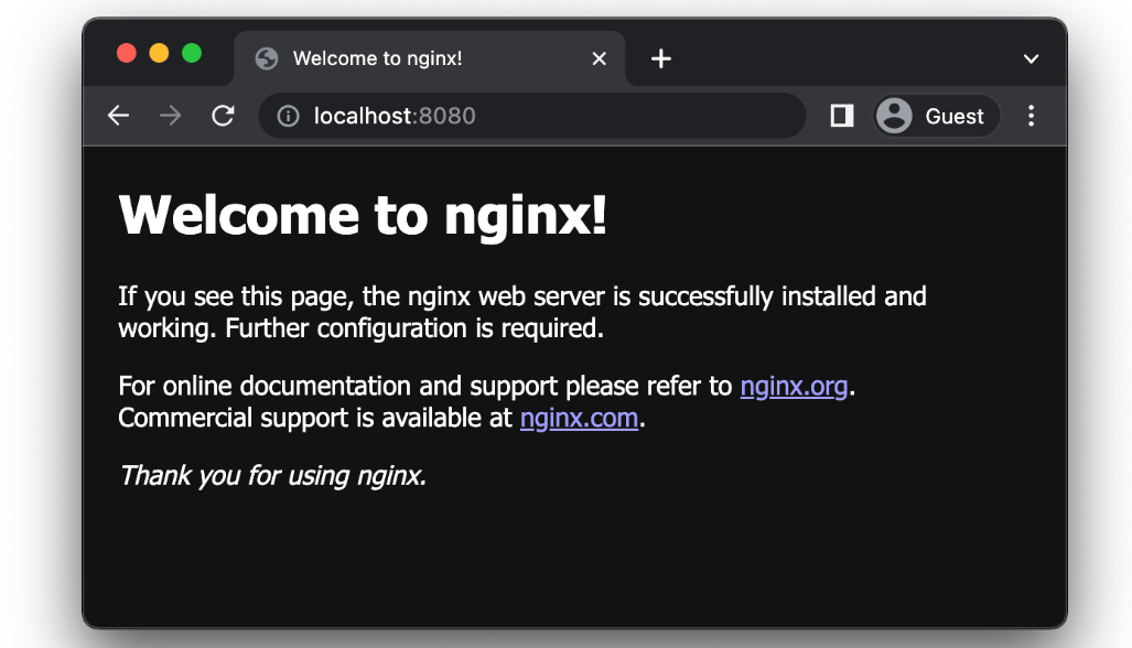 - 현재 Nginx 서버가 로컬호스트에 띄워져있고 listen할 port를 8080으로 설정해두었으니, 브라우저에서 localhost:8080 혹은 host IP:8080에 요청을 보내 확인해보면 됩니다.