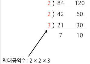 84와 120의 최대공약수는 2*2*3인 12입니다! 저렇게 소수를 나누다보면 나오게 됩니다.