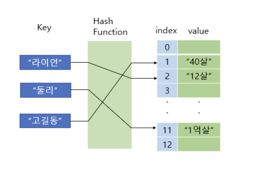 우리가 정한 키 값이 해시 함수를 통해 인덱스로 변환되고 그 인덱스에 우리가 정한 value값의 배열이 생성되는 것